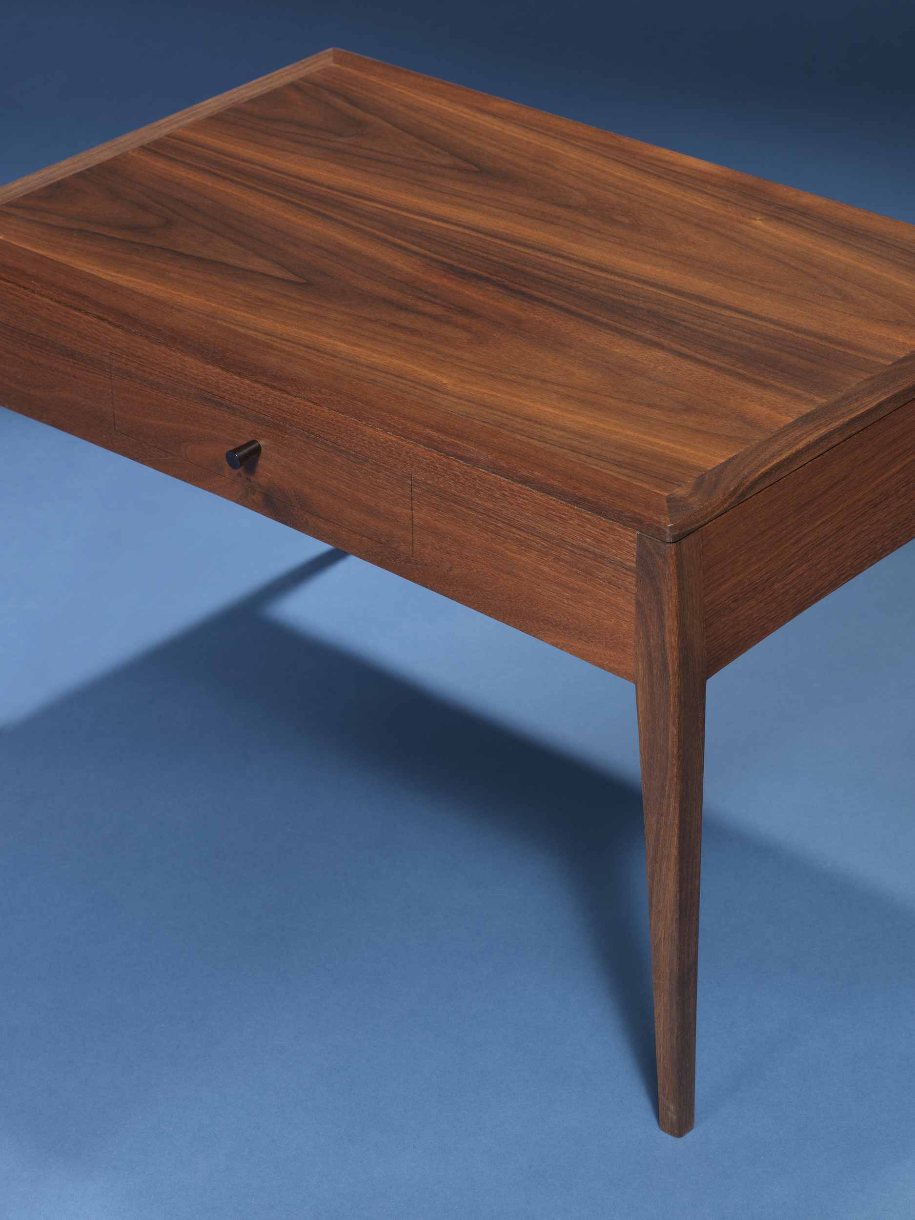 Compact coffee table in black walnut with piston-fit drawer in maple. Very tight hand cut dovetails on the drawer.