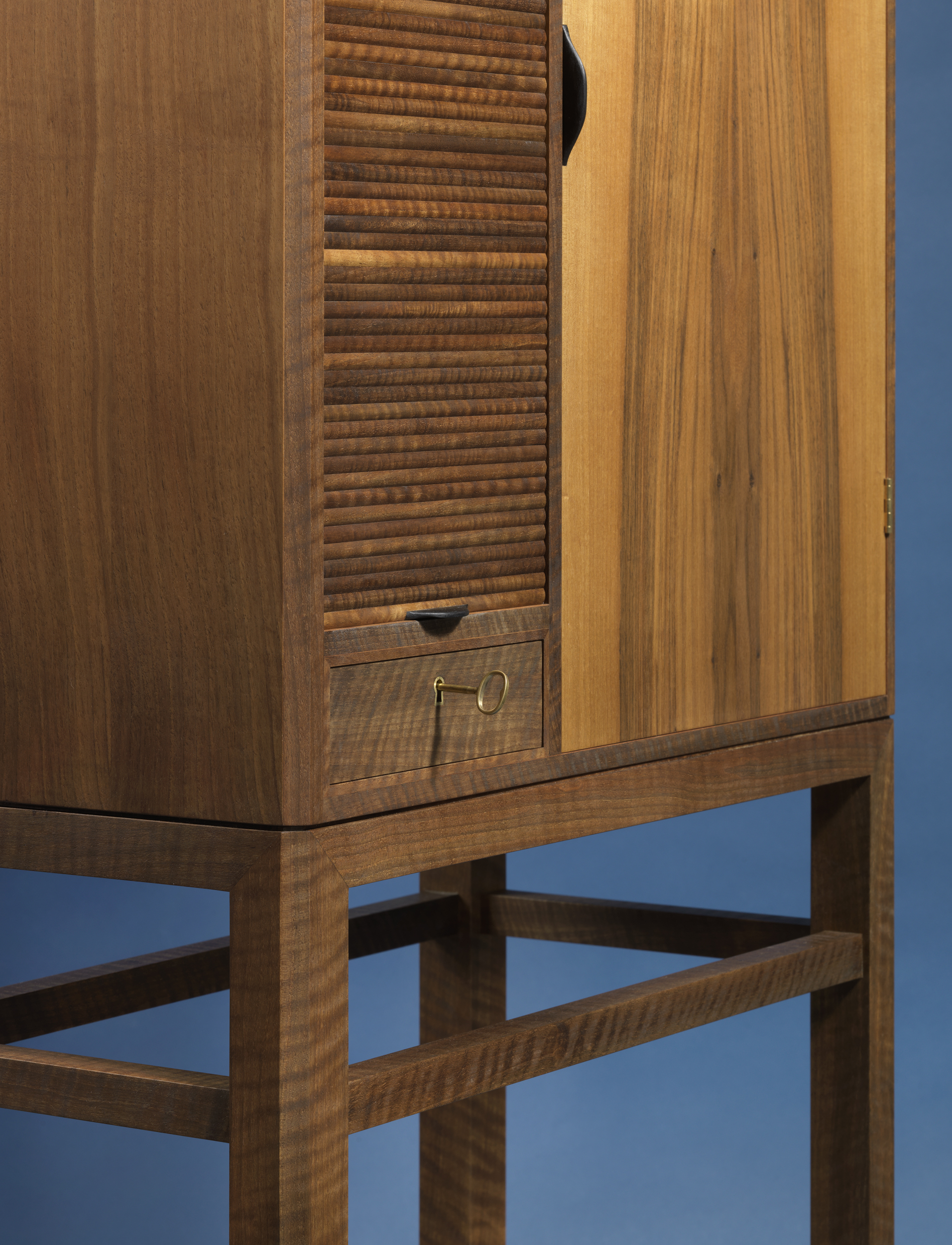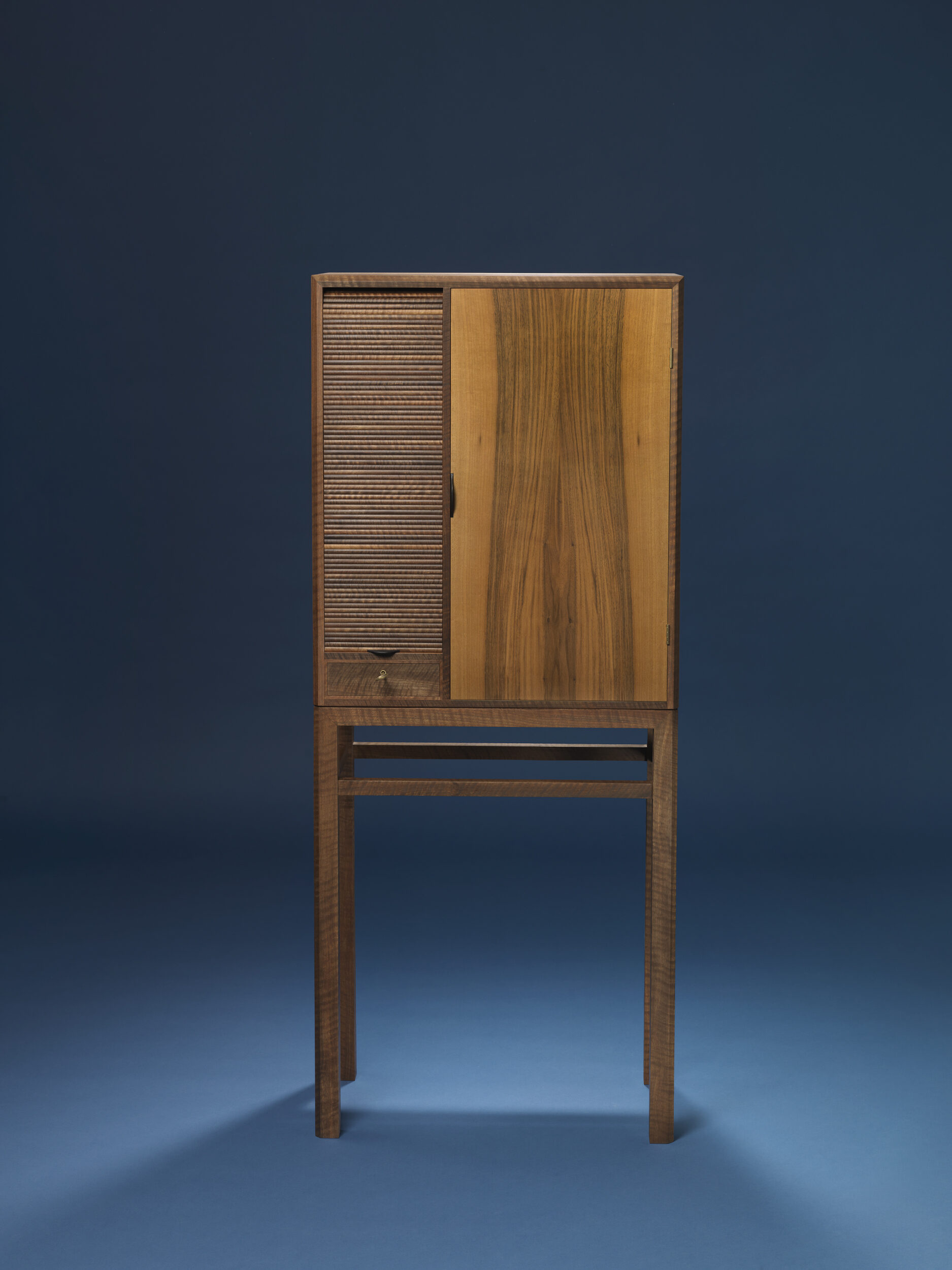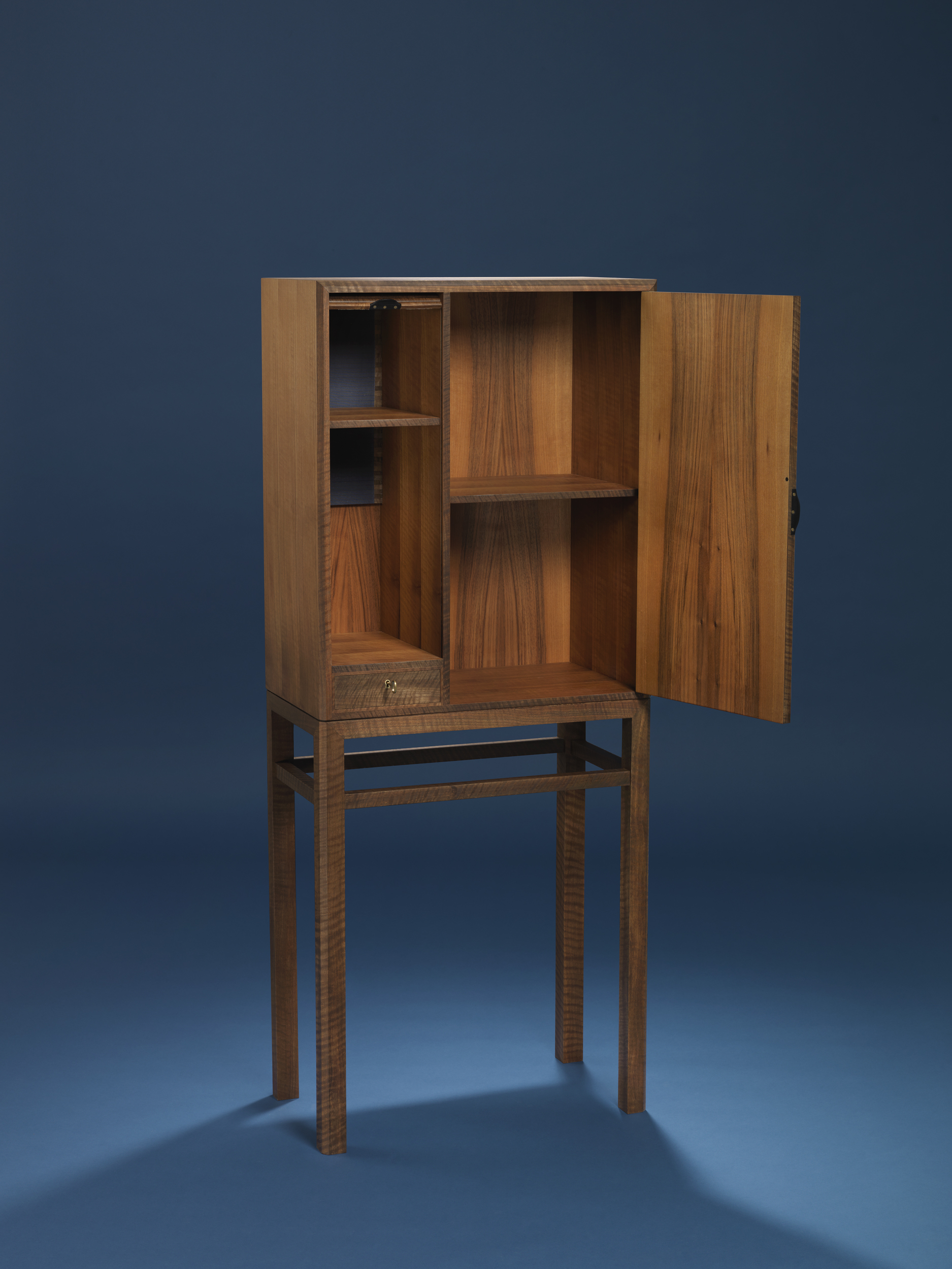 Skabet er udført i fransk valnød, og fungerer som det perfekte udstillingsvindue for det helt særlige materiale — her oplever man virkelig den karamelagtige farve, changeringerne og de bølgede åretegninger, der kendetegner den eftertragtede træsort.